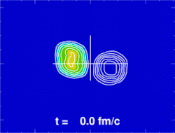 Réaction très inélastique entre deux noyaux lourds (Xe+Sn à 35 Mev/u) modélisée avec l'équation de Boltzmann quantique. Les courbes de niveau représentent la densité nucléaire projetée sur le plan de réaction; en niveaux de couleur pour le noyau projectile pour illustrer les échanges de nucléons.
