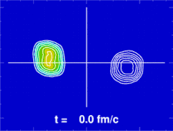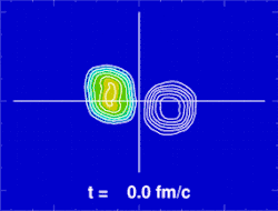 Collisions centrales:: fusion des 2 noyaux Résultat d'un calcul avec l'équation de Boltzmann quantique d'une réaction de fusion de noyaux lourds (Sn+Xe à 10 MeV/u). Les courbes de niveau représentent la densité nucléaire projetée sur le plan de réaction (cadre 80 x 60 fermis) en niveaux de couleur pour le noyau projectile pour illustrer les échanges de nucléons. L'échelle des temps est le fm/c, temps de parcours de la lumière pour 1 fm.: avec formation d’un noyau composé (qui a «oublié» les caractéristiques des noyaux qui le composent). Ce noyau composé est dans un état excité, loin de son état fondamental; il se désexcite, selon les cas, par émission de photons, de protons, de neutrons, ou par radioactivité alpha et bêta, ou enfin par fission, s’il a une charge électrique importante et est en rotation. C'est ce type de réaction qui est recherché pour la production de noyaux superlourds[16].