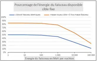 Lorsque les noyaux d’un faisceau accéléré interagissent avec ceux d’une cible fixe, les lois de conservation ci-dessus donnent une limite maximale à la part de l’énergie cinétique disponible pour la réaction. La figure ci-dessous donne cette limite dans l’hypothèse (rarement atteinte) où les deux noyaux fusionnent complètement, sans émission de particules.