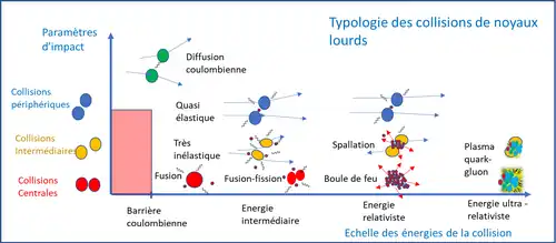 Il en résulte une très grande variété de phénomènes[2]. Par exemple: à basse énergie, création de deux noyaux en sortie, proches des noyaux initiaux; à plus haute énergie, multifragmentation (noyaux légers et nucléons isolés) et création de particules élémentaires nouvelles; dissociation des nucléons eux-mêmes aux énergies ultrarelativistes.
