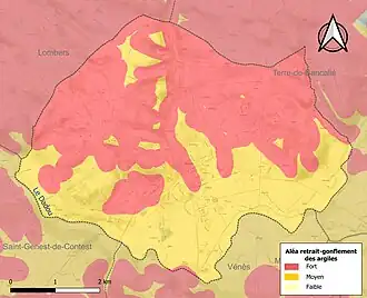 La commune est vulnérable au risque de mouvements de terrains constitué principalement du retrait-gonflement des sols argileux[25]. Cet aléa est susceptible d'engendrer des dommages importants aux bâtiments en cas d’alternance de périodes de sécheresse et de pluie. La totalité de la commune est en aléa moyen ou fort (76,3 % au niveau départemental et 48,5 % au niveau national). Sur les 1 488 bâtiments dénombrés sur la commune en 2019, 1 488 sont en aléa moyen ou fort, soit 100 %, à comparer aux 90 % au niveau départemental et 54 % au niveau national. Une cartographie de l'exposition du territoire national au retrait gonflement des sols argileux est disponible sur le site du BRGM[26],[Carte 3].