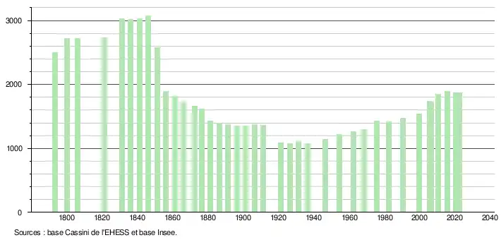 | L'évolution du nombre d'habitants est connue à travers les recensements de la population effectués dans la commune depuis 1793. Pour les communes de moins de 10 000 habitants, une enquête de recensement portant sur toute la population est réalisée tous les cinq ans, les populations de référence des années intermédiaires étant quant à elles estimées par interpolation ou extrapolation[39]. Pour la commune, le premier recensement exhaustif entrant dans le cadre du nouveau dispositif a été réalisé en 2005[40]. En 2022, la commune comptait 1 867 habitants[Note 8], en évolution de −2,71 % par rapport à 2016 (Tarn-et-Garonne : +3,12 %, France hors Mayotte : +2,11 %). |