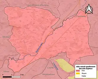 Le retrait-gonflement des sols argileux est susceptible d'engendrer des dommages importants aux bâtiments en cas d’alternance de périodes de sécheresse et de pluie. La totalité de la commune est en aléa moyen ou fort (92 % au niveau départemental et 48,5 % au niveau national). Sur les 800 bâtiments dénombrés sur la commune en 2019, 800 sont en aléa moyen ou fort, soit 100 %, à comparer aux 96 % au niveau départemental et 54 % au niveau national. Une cartographie de l'exposition du territoire national au retrait gonflement des sols argileux est disponible sur le site du BRGM[31],[Carte 3].