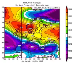 - ↑ (en) E. Kalnay et al., « The NCEP/NCAR 40-Year Reanalysis Project », Bull. Amer. Meteor. Soc., American Meteorological Society, vol. 77, no 3, , p. 437–471 (DOI 10.1175/1520-0477(1996)077%3C0437:TNYRP%3E2.0.CO;2 10.1175/1520-0477(1996)077%3C0437:TNYRP%3E2.0.CO;2, lire en ligne [PDF])