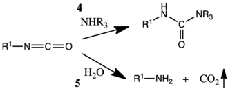 L'isocyanate peut ensuite être utilisé pour produire un carbamide en présence d'amines (4) ou produire des amines en présence d'eau (5).