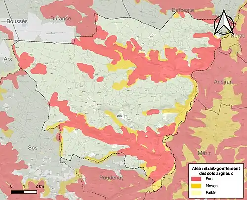 Le retrait-gonflement des sols argileux est susceptible d'engendrer des dommages importants aux bâtiments en cas d’alternance de périodes de sécheresse et de pluie[21]. 40 % de la superficie communale est en aléa moyen ou fort (91,8 % au niveau départemental et 48,5 % au niveau national)[Carte 2]. Depuis le , en application de la loi ELAN, différentes contraintes s'imposent aux vendeurs, maîtres d'ouvrages ou constructeurs de biens situés dans une zone classée en aléa moyen ou fort[Note 5],[22].