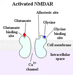 Les récepteurs NMDA sont des tétramères[2], formés de deux sous-unités NR1 et de deux sous-unités NR2 (NR2A, NR2B, NR2C ou NR2D). Les sous-unités NR1 sont obligatoires, tandis que les sous-unités NR2 spécifient les propriétés électrophysiologiques des récepteurs NMDA, tel leur sensibilité au glutamate, leur perméabilité au calcium, l'inhibition du magnésium. Les sous-unités NR2 spécifient également leurs interactions avec les protéines intracellulaires. Les sites de liaison de la glycine sont localisés sur les sous-unités NR1, tandis que les sites de liaison du glutamate sont situés sur les sous-unités NR2.