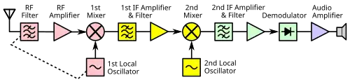 Par exemple, pour un récepteur qui peut s'accorder de 500 kHz à 30 MHz, trois convertisseurs de fréquence peuvent être utilisés[7]. Avec une FI de 455 kHz, il est facile d'obtenir une sélectivité frontale adéquate avec les signaux de la bande de radiodiffusion (inférieurs à 1600 kHz). Par exemple, si la station reçue est sur 600 kHz, l'oscillateur local peut être réglé sur 1055 kHz, ce qui donne une image sur (-600+1055=) 455 kHz. Mais une station sur 1510 kHz pourrait aussi potentiellement produire une image sur (1510-1055=) 455 kHz et donc causer des interférences d'image. Cependant, comme 600 kHz et 1510 kHz sont très éloignés l'un de l'autre, il est facile de concevoir l'accord frontal pour rejeter la fréquence de 1510 kHz.