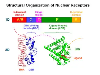 Les récepteurs nucléaires sont des protéines dont la taille varie classiquement entre 40 et 100 kilodaltons (kDa). Ils ont été subdivisés arbitrairement en 5 (ou 6) domaines (A, B, C, D, E (F)).