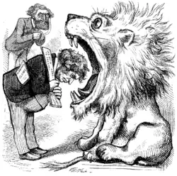 Charles Sumner mettant sa tête dans la gueule du lion britannique. Cette caricature parue dans l'édition du Harper's Weekly du devait être parlante pour les contemporains : Sumner court le risque de sacrifier sa forte popularité en Angleterre en soutenant de tout son charisme les exorbitantes réclamations américaines, dont il a un exemplaire en poche. Et pour empêcher le lion britannique de lui écraser la tête, il tient en outre un « ouvre-gueule » rappelant que les États-Unis ont vendu des armes à la France en guerre avec l'Allemagne, malgré leur déclaration de neutralité. En arrière-plan, l'homme politique américano-allemand Carl Schurz se frotte les mains.