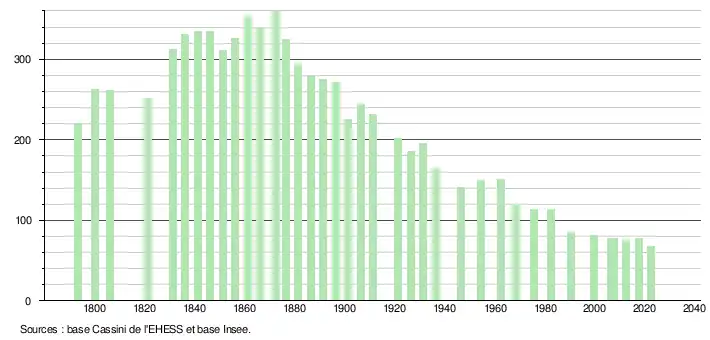 L'évolution du nombre d'habitants est connue à travers les recensements de la population effectués dans la commune depuis 1793. Pour les communes de moins de 10 000 habitants, une enquête de recensement portant sur toute la population est réalisée tous les cinq ans, les populations de référence des années intermédiaires étant quant à elles estimées par interpolation ou extrapolation[18]. Pour la commune, le premier recensement exhaustif entrant dans le cadre du nouveau dispositif a été réalisé en 2007[19].