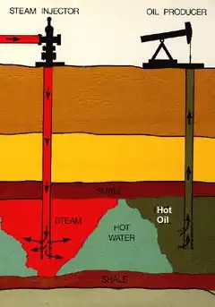 Les injections de vapeur (voir croquis) sont un moyen d'introduire de la chaleur dans le réservoir par pompage de la vapeur dans le puits avec des moyens similaires à l'injection d'eau. Elles sont utilisées pour des pétroles très visqueux[12]. La vapeur se condense en eau chaude dans la zone en contact avec le pétrole. Le pétrole se dilate dans la zone avec l'eau chaude. Ainsi, la viscosité du pétrole chute et la perméabilité du réservoir augmente. Pour fonctionner le processus doit être cyclique. Ceci est la méthode la plus utilisée actuellement pour la récupération assistée du pétrole.
