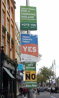 Les deux grands partis qui forment la coalition qui gouverne l'Irlande - le Parti travailliste et le Fine Gael - ont mené la campagne pour l'acceptation de la modification. Du côté du non, on retrouve principalement le Sinn Féin, mais aussi l'Alliance de la gauche unie.