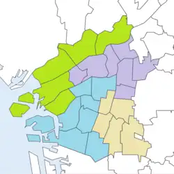 | Konohana-ku | 54,470 | 17,597 | 18,872 | 48.3% | 36,469 | 137 | 36,606 | 67,2 % | Wangan-ku | |