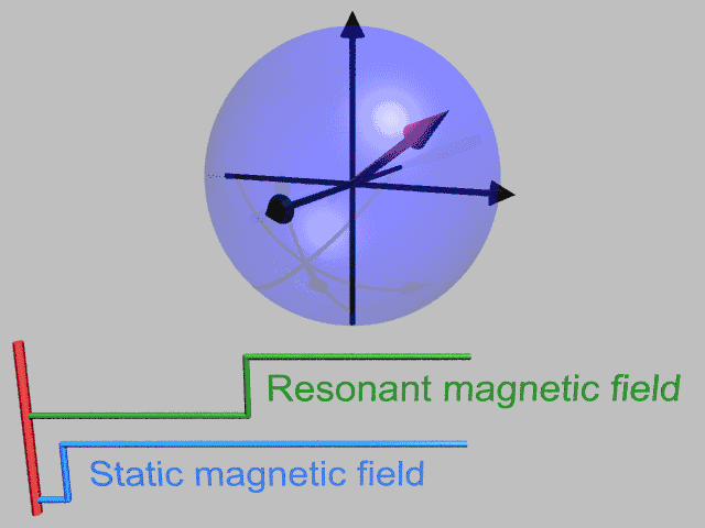Cette animation montre le système de référence en rotation. La flèche rouge est la rotation dans la sphère de Bloch qui précède dans la référence du laboratoire à cause du champ magnétique statique. Avec un système de référence en rotation le spin reste immobile jusqu'à ce qu'un des champs magnétiques oscillants ne change la résonance magnétique.