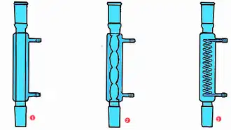 Schéma de plusieurs réfrigérants utilisés dans divers montage en chimie. De gauche à droite : réfrigérant droit, réfrigérant à boules, réfrigérant à serpentins.