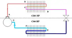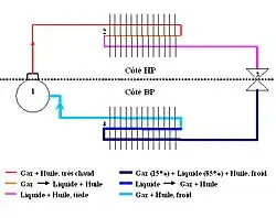 Comme dessiné sur ce schéma, le compresseur met en circulation le réfrigérant. Il sort de l’orifice HP (haute pression) du compresseur à l’état gazeux, plus chaud qu'il n'y est entré. Il traverse alors le côté HP en commençant par le condenseur.