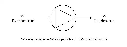 En effet, la compression de tout fluide quel qu'il soit nécessite de l'énergie (dans le cas d'une compression mécanique on la mesurera en joules), et ce quel que soit le rendement du compresseur. Cette énergie doit donc être évacuée au condenseur pour que le système soit à l'équilibre. Plus le rendement du compresseur est mauvais, et plus la quantité d'énergie à évacuer au condenseur sera élevée.