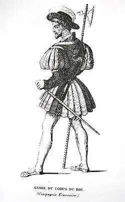 Aux Écossais de la guerre de Cent Ans et aux Suisses venus grossir les rangs de l'armée royale dès la fin du Moyen Âge — en ce compris, les uns et les autres, au sein de la garde personnelle du souverain — viendront ainsi, à la fin de la Renaissance, se joindre de nombreux Allemands — qui « font foule […] dans les milices françaises, la royauté achetant des lansquenets et des reîtres allemands aussi volontiers que les Suisses »[7] — ainsi que les premiers catholiques irlandais, venus en France à la suite de l'établissement de l'anglicanisme dans les îles britanniques après le schisme de Henry VIII. Ces « nations »[note 2] fourniront désormais l'essentiel des effectifs des régiments étrangers au service de la royauté et ce jusqu'à la fin de l'Ancien régime.