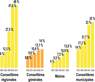 Les conseils régionaux sont les assemblées élues les plus féminisées de France, essentiellement grâce à l'application aux élections régionales de la loi du 6 juin 2000 puis de celle du 11 avril 2003, qui a institué l'obligation de parité stricte des listes[27]. Les disparités régionales existent certes mais demeurent limitées, compte tenu de la quasi parité atteinte dans l'ensemble de la France lors de ces élections. À l'issue des élections de 2004, la Martinique, avec 51,2 % de conseillères régionales, avait l'assemblée régionale qui comportait le plus de femmes, suivie de la Bretagne (50,6 %) et du Nord-Pas-de-Calais (46,5 %). Le conseil régional le moins féminisé était celui de Poitou-Charentes, avec 43,6 % de femmes, soit 4 points de moins que la moyenne nationale[27].