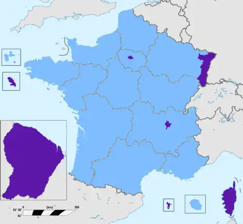 Carte des 14 collectivités régionales françaises (en bleu clair), des 6 collectivités à statut particulier et de la Collectivité d'Alsace (en violet). |