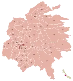 Elle est administrativement formée des 57 municipalités suivantes, dont la numérotation ne suit pas exactement l'ordre alphabétique :