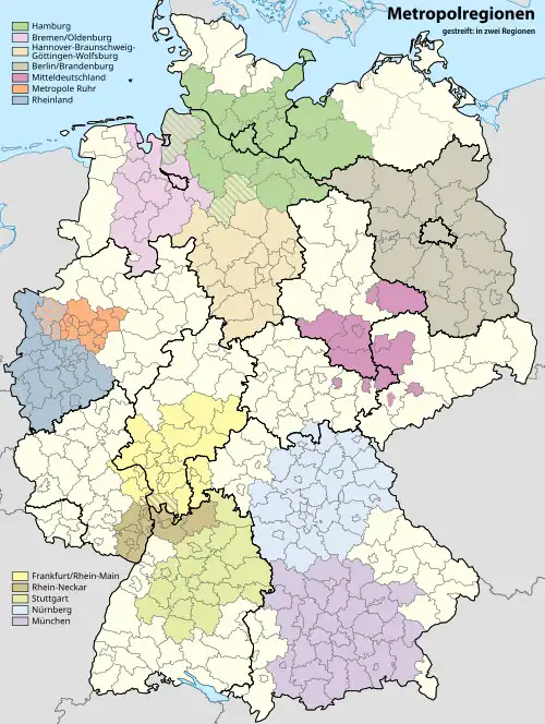 Par rapport aux autres régions métropolitaines allemandes, la région d'Allemagne centrale a la particularité de ne compter aucun arrondissement rural mais seulement des centres urbains qui coopèrent les uns avec les autres. Ce n'est donc pas une aire urbaine puisque la campagne entre les métropoles n'est pas incluse. Une coopération plus étroite avec les zones rurales dans un rayon de 100 km autour de Leipzig et de Halle est néanmoins en cours depuis 2014[2].