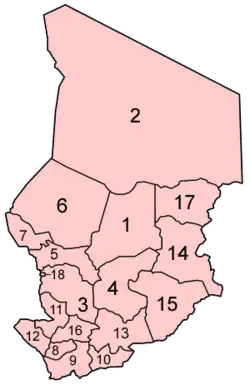 Depuis l'indépendance en 1960 jusqu'en 1999, le Tchad a été divisé en 14 préfectures. Celles-ci ont été remplacées en 1999 par 28 départements. Le pays a été à nouveau réorganisé en 2002 pour donner naissance à 18 régions[3],[2].