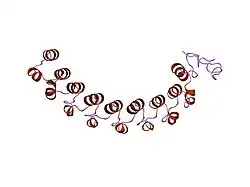 Une répétition riche en leucine, ou leucine-rich repeat (LRR) en anglais, est un motif structurel présent dans certaines protéines où il forme un repliement en fer à cheval α/β[4],[5]. Ce type de repliement est constitué de séquences de 20 à 30 résidus d'acides aminés contenant une forte proportion de leucine, un acide aminé hydrophobe, constituant un domaine en forme de solénoïde. Chaque élément répété est généralement constitué de l'enchaînement feuillet β–coude–hélice α, dont la répétition constitue un domaine qui présente globalement la géométrie d'un fer à cheval dont l'intérieur est formé de feuillets β parallèles et l'extérieur est formé d'un réseau d'hélices α. Une face des feuillets β et un côté des hélices α sont exposés au solvant et sont par conséquent constitués essentiellement de résidus hydrophiles, tandis que la région comprise entre les hélices et les feuillets forme le cœur hydrophobe de la protéine dans lequel sont enfouis les résidus de leucine.