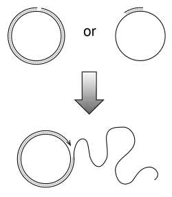 La synthèse continue d’ADN peut générer plusieurs copies simples brins de la molécule d’ADN originale arrangées en concatémère. Ces copies linéaires peuvent être converties en molécules doubles brins. Pour cela, la protéine initiatrice génère une nouvelle coupure simple brin pour terminer la synthèse circulaire du brin direct (leading strand en anglais), cette coupure est appelée origine simple brin (single-stranded origin ou SSO). Ensuite, une primase synthétise une amorce ARN qui sert à déclencher la duplication de l’ADN par une ADN polymérase de type II. Une fois l’amorce ARN remplacée par de l’ADN, une ADN ligase va lier les extrémités pour former une molécule d’ADN double brin.