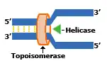 D'autres enzymes sont nécessaires au bon fonctionnement de la réplication d'ADN. Puisque le placement des histones dans la chromatine régule l'expression génétique, des protéines chaperons séparent les histones de l'ADN avant la réplication et les remettent après aux mêmes endroits[7]. Les polymérases sont retenues à l'ADN parental par des protéines tenons et des protéines à pince coulissante. C’est le PCNA des eucaryotes et des archées, et la sous unité b des bactéries. Une hélicase brise les liaisons H entre les deux brins, et des protéines SSB se fixent à l'ADN monocaténaire par des liaisons salines, pour éviter la reformation de liaisons entre les deux brins. Sur l'ADN double brin précédant l'hélicase se fixe une topoisomérase I qui va permettre d'éviter les torsions entraînées par l'ouverture de la double-chaîne par l'hélicase (comme pour une ficelle dont on écarte les deux brins), en coupant un des brins, puis le ressoudant après déroulement. Une topoisomérase II va se fixer sur une des molécules d'ADN filles, et par la scission des deux brins de celle-ci, va permettre le démêlement des 2 ADN filles. Elle ressoude ensuite (après le passage de l'autre molécule dans l'interstice formé) la molécule lysée.