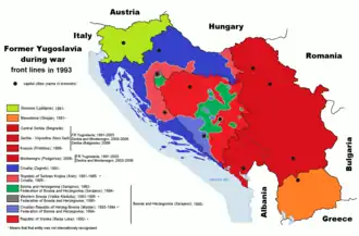 La république fédérale de Yougoslavie soutient les mouvements séparatistes serbes dans les États sécessionnistes, notamment la république serbe de Krajina et la Republika Srpska (en), et cherche à en faire des républiques serbes indépendantes, susceptibles d'être réintégrées à terme dans la république fédérale de Yougoslavie[17],[18]. Toutefois, le gouvernement de la république fédérale de Yougoslavie traite ces républiques comme des entités distinctes et leur apporte une aide officieuse, plutôt qu'active, en transférant le contrôle d'unités de l'Armée populaire yougoslave (JNA) aux mouvements sécessionnistes[19]. De cette manière, la Yougoslavie évite d'être accusée de commettre des actes d'agression contre les républiques sécessionnistes reconnues par la communauté internationale[20],[21]. Slobodan Milošević, le président serbe, ne se considère pas comme étant en guerre avec les républiques sécessionnistes de Yougoslavie.