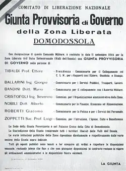 - Corrado Bonfantini, en tant que représentant de la mission CLNAI à Domodossola et ensuite du conseil de gouvernement provisoire auprès de la CLNAI elle-même à Milan ; futur membre de l'Assemblée constituante et député aux Ière, IIème et IIIᵉ législatures [14]