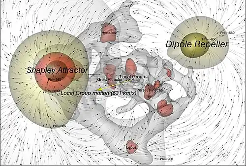 L'attracteur Shapley, une autre zone à l'opposé du point de vue de la Voie lactée, crée une force attractive sur le mouvement des galaxies. Cette attraction localisée, complétée par la position du répulseur du dipôle, sont les principaux contributeurs de l'anisotropie dipolaire du fond diffus cosmologique.