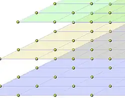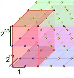 La figure 24 illustre un exemple similaire en dimension 3. L'anneau (dont les points sont représentés par les petites billes) est ici ℤ[3√2], de base B = (1, 3√2, 3√4) considérée comme orthonormée, et l'idéal principal M (dont les points sont en rouge) est engendré par α = 2. Le domaine fondamental du sous-réseau M est le cube rouge, constitué des points dont les coordonnées dans la base 2B de M appartiennent à [0, 1[ (c'est-à-dire dont les coordonnées dans B appartiennent à [0, 2[). Son volume, égal à la norme de α, soit 23 = 8 (déterminant de l'homothétie de rapport 2 en dimension 3), est bien égal au nombre de points du réseau appartenant au cube rouge. Chaque classe du quotient A/M = A/(2A) est représentée par l'un de ces 8 points: si β est un point quelconque de A, il est congru, modulo 2A, au point dont les coordonnées sont les restes (0 ou 1) des divisions euclidiennes par 2 de celles de β.