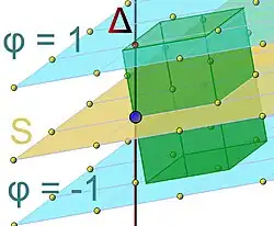 Pour montrer ce résultat, on va montrer qu'il n'existe qu'un nombre fini de valeurs atteintes par φ sur l'intervalle [−1, 1]. Tous les points du réseau ayant une image par φ dans cet intervalle se trouvent entre les hyperplans affines d'équation φ(x) = − 1 et φ(x) = 1, représentés en bleu sur la figure 5. Soit V le volume de ℝn composé des vecteurs compris entre les deux hyperplans et dont les coordonnées, dans la base (bi), de la projection orthogonale par p sur S, sont toutes comprises entre 0 et 1. Le volume V est représenté en vert sur la figure 5. On remarque que V est bien borné car il représente l'ensemble des vecteurs de ℝn ayant des coordonnées comprises entre 0 et 1 dans la base (bi, ,π). Ici π désigne le vecteur orthogonal à S et d'image égale à 1 par la forme φ. Si δ est un nombre réel, compris entre −1 et 1, et image du réseau par φ, δ possède un antécédent dans V. En effet, il existe un vecteur u du réseau compris entre les deux hyperplans et tel que φ(u) = δ. Le vecteur p(u) est dans S et se décompose sur la base (bi); soit (ui) les coordonnées de p(u) dans cette base. Si qi désigne la partie entière de ui et ri la partie fractionnaire: