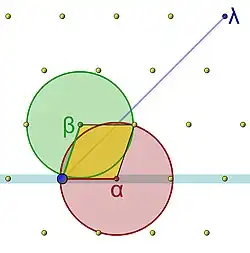 Montrons maintenant que tout vecteur du réseau est combinaison linéaire de α et β, à coefficients entiers. Considérons le disque rouge, de centre α et de rayon la norme de β, un tel disque ne peut contenir comme point du réseau, en dehors de sa frontière, que quelques multiples de α dans la zone bleue sur la figure 3, d'après la définition de la norme de β. Le disque vert est de centre β et de rayon la norme de α. Le même raisonnement montre que l'intérieur de ce disque ne peut contenir aucun point du réseau. Le segment [0, α] ne peut contenir que ses extrémités comme point du réseau, il en est de même pour le segment [0, β]. Il en est aussi de même pour [α, β] et [β, α + β] car sinon, en soustrayant α ou β, on aurait une contradiction. En résumé, le parallélogramme, en jaune, de sommets 0, α, β et α + β ne contient aucun autre point du réseau que ses sommets. On remarque que ce parallélogramme est constitué des vecteurs de ℝn ayant deux coefficients compris entre 0 et 1 dans la base (α, β).
