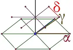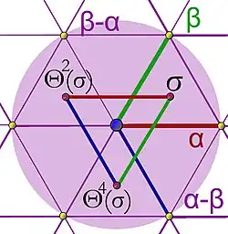 On utilise ici une technique géométrique. On cherche un plan Δ le plus invariant possible par les isométries du groupe orthogonal G. Soit Θ une rotation d'ordre 6, c'est-à-dire d'un angle de π/3. Une telle rotation existe, il existe un élément d'ordre 6, soit cet élément, soit son opposé est une rotation et ces deux isométries sont dans G. La rotation Θ laisse un unique plan invariant, on suppose donc que Δ est celui-là. Soit α un point non nul du réseau dans le plan Δ et de norme minimale. La même technique ayant servi à montrer que tout plan invariant par le groupe orthogonal contient un sous-réseau de dimension 2, permet de montrer que le plan Δ contient un sous-réseau de dimension 2 et que α existe bien. Les images de α par les itérés de Θ forment un hexagone, comme sur la figure 20. On note β l'image de α par Θ. L'objectif est de montrer que Δ est bien stable par tous les éléments de G. Pour cela on considère Σ une rotation qui ne laisse pas le plan invariant. Soit l'image de α par Σ, soit celle de β n'est pas dans Δ. Quitte à modifier les notations d'un sixième de tour, on peut toujours supposer que le point γ, égal à Σ(α), n'est pas dans le plan.