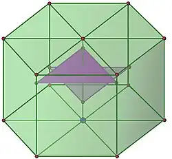 Chaque axe principal contient des éléments du réseau. Montrons-le pour l'axe dirigé par i; la démonstration serait la même pour j et k. Remarquons dans un premier temps que la rotation, d'axe dirigé par i et d'un demi tour, est un élément de A4. Pour s'en persuader, il est possible de calculer la matrice de la représentation de la permutation (ab)(cd). Soit α un élément non nul du réseau ayant pour coordonnées dans la base canonique (x, y, z), le point (x, −y, −z) est élément du réseau car image de α par la rotation d'un demi tour. La somme de ces deux points est encore un élément du réseau, ayant une composante nulle sur j et k.