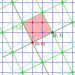 La figure 23 illustre cette interprétation lorsque M est l'idéal principal engendré par l'entier algébrique α = 2 + i dans les entiers de Gauss, c'est-à-dire que les points du sous-réseau sont les produits de α par un entier de Gauss quelconque. Une base du réseau A étant B = (1, i), une base du sous-réseau M = αA est αB = (α, αi) = (2 + i, –1 + 2i). Ce sous-réseau est représenté par les points verts sur la figure. Une classe d'équivalence de l'anneau quotient est géométriquement représentée par un décalage du réseau vert et qui contient un point du quadrillage, par exemple une classe est illustrée par les points bleus. Chaque classe contient un représentant dans la zone rouge des vecteurs de coordonnées comprises dans l'intervalle [0, 1[ dans la base (2 + i, –1 + 2i). Le nombre d'entiers de Gauss (réseau représenté par le quadrillage bleu foncé) qui se trouvent dans ce domaine fondamental est égal à la valeur absolue du déterminant de la base αB de M dans la base B de A. Ce déterminant (toujours positif dans l'exemple des entiers de Gauss, mais parfois négatif dans d'autres anneaux d'entiers algébriques) est appelé la norme arithmétique de α. Un rapide calcul montre que la norme arithmétique d'un entier de Gaussa + ib est égale à a2 + b2. Dans l'exemple choisi, le nombre d'entiers de Gauss qui se trouvent dans le domaine fondamental est bien égal à 5, la norme de 2 + i.