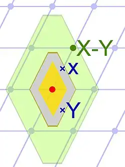 Définition[1]—Le domaine fondamental par rapport à une base B, si B est une base (bi) du réseau est l'ensemble des points P: