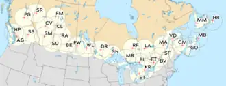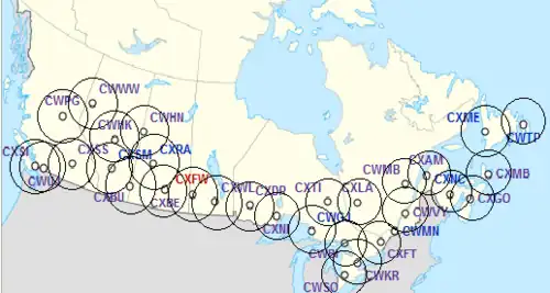 | Cold Lake | Saskatchewan NO / Alberta NE | Alberta | CASCL | S | METEOR 1700 S | 54° 22′ 43″ N, 110° 03′ 41″ O | Nouveau site qui remplace Jimmy Lake (CWHN). Entré en service le 26 octobre 2021. |