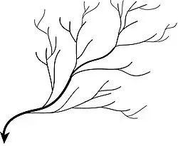 Les systèmes de drainage dendritiques (dendritic drainage pattern, du Grec δενδρίτης, dendrites, « ramification d'un arbre ») sont la forme la plus courante de système de drainage. Dans un système dendritique, il existe de nombreux ruisseaux contributifs (analogues aux rameaux d'un arbre), qui sont ensuite réunis dans les affluents du fleuve principal (les branches et le tronc de l'arbre, respectivement). Ils se développent là où le chenal de la rivière suit la pente du terrain. Les systèmes dendritiques se forment dans des vallées en forme de V ; en conséquence, les types de roche doivent être imperméables et non poreux[2].