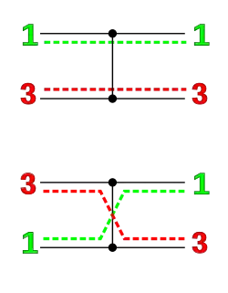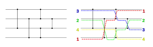 Formellement, si le fil supérieur contient x et le fil inférieur y, alors après avoir touché un comparateur les fils portent et respectivement, de sorte que la paire de valeur est triée[1]:p. 682. Un réseau composé de fils et de comparateurs est un réseau de comparateurs. Un réseau de comparateurs qui trie correctement toutes les entrées possibles dans l'ordre croissant est appelé un réseau de tri.