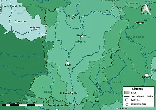 Le schéma d'aménagement et de gestion des eaux (SAGE) est un outil de planification au périmètre plus restreint que le SDAGE. Il est fondé sur une unité de territoire où s’imposent une solidarité physique et humaine (bassins versants, nappes souterraines, estuaires, …). Il fixe les objectifs généraux, les règles, les actions et moyens à mettre en œuvre pour gérer la ressource en eau et concilier tous ses usages. Le SAGE est élaboré par une commission locale de l'eau (C.L.E.) composée d’élus, d’usagers et de représentants de l’État. Il doit être approuvé par le Préfet après avis du comité de bassin pour devenir opposable aux décisions publiques. Les SAGE doivent être compatibles avec les orientations du SDAGE en application sur leur territoire[17]. Quatre SAGE concernent le département de la Mayenne : Sarthe amont, Sarthe aval, Mayenne et Oudon[18].