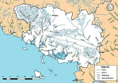 Pour un cours d'eau de deuxième catégorie, l'espèce biologique dominante est constituée essentiellement de poissons blancs (cyprinidés) (donc rivière cyprinicole) et de carnassiers (brochet, sandre et perche). Depuis les années 1990 ce type de rivières est également peuplé de silures[26]. Dans le Morbihan, sont classés en deuxième catégorie piscicole toutes les cours d'eau ou partie de cours d'eau suivants[27] :