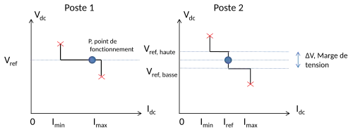 Deux stratégies de commande de la tension sont envisagées : à marge de tension et à chute de tension. Dans le premier cas, la commande d'un poste va maintenir la tension constante quel que soit le courant. Les autres postes sont réglés en courant et maintiennent celui-ci constant tant que la tension reste dans un plage définie. Si ce n'est plus le cas, le poste va prendre la commande de la tension, l'ancien poste maître va passer en réglage de courant. Dans le cas de la commande à chute de tension, la consigne de tension diminue avec le courant. Le principe maître-esclave peut également être ajouté à cette dernière stratégie, dans ce cas le dépassement de la plage de tension pour un poste fait passer sa commande de courant à tension[27].