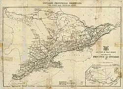 Les routes et autoroutes en Ontario obtiennent la première considération sérieuse par le gouvernement provincial lorsque le Department of Public Highways (DPHO), prédécesseur du Ministère des Transports de l'Ontario, est créé le 17 janvier 1916. Jusque-là, la majorité des routes principales dans le sud de l'Ontario sont de la responsabilité des comtés. Le Department of Public Works finance jusqu'à 60 % des coûts de construction et d'entretien pour ces routes alors que les comtés payent le reste[57]. Le gouvernement adopte une loi en 1917 pour permettre au nouveau DPHO de prendre en charge la mise en place et l'entretien d'un réseau routier provincial. Le réseau initial, entre Windsor et Québec, est complété avec des branches vers Niagara et Ottawa[58]. En 1919, le gouvernement fédéral adopte une loi octroyant une somme d'argent aux provinces à la condition qu'elle établissent un réseau routier officiel; jusqu'à 40 % des coûts de construction étaient alors assumés par le gouvernement fédéral. Le premier plan est approuvé le 26 février 1920[57].