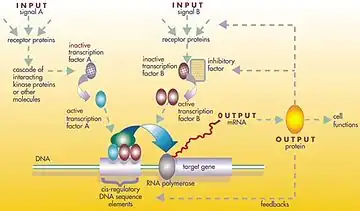 En général, chaque molécule d'ARNm produit une protéine spécifique (ou un ensemble de protéines). Dans certains cas, cette protéine sera structurelle et s'accumulera au niveau de la membrane cellulaire ou à l'intérieur de la cellule pour lui conférer des propriétés structurelles particulières. Dans d'autres cas, la protéine sera une enzyme, c'est-à-dire une micro-machine qui catalyse une certaine réaction, telle que la dégradation d'une source alimentaire ou d'une toxine. Certaines protéines ne servent cependant qu'à activer d'autres gènes, et ce sont les facteurs de transcription qui sont les principaux acteurs des réseaux ou cascades de régulation. En se liant à la région promotrice au début d'autres gènes, ils les activent, initiant la production d'une autre protéine, et ainsi de suite. Certains facteurs de transcription sont inhibiteurs[1].
