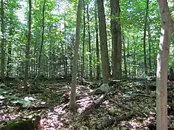La zone mésique, quant à elle, a un drainage moyen à bon et est largement dominée par l’érable à sucre (56 %) et le hêtre à grandes feuilles (15,9 %)[1]. Une prucheraie (6,4 %) occupe également la partie nord-ouest du boisé[1]. Ces essences sont entre autres accompagnées de tilleul d’Amérique (9,2 %) et d’ostryer de Virginie (8,2 %)[1]. La végétation au sol est faible, ce qui est typique des érablières à hêtre, où la luminosité est faible et où la litière de hêtre rend le sol acide[1].